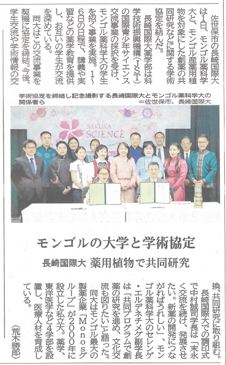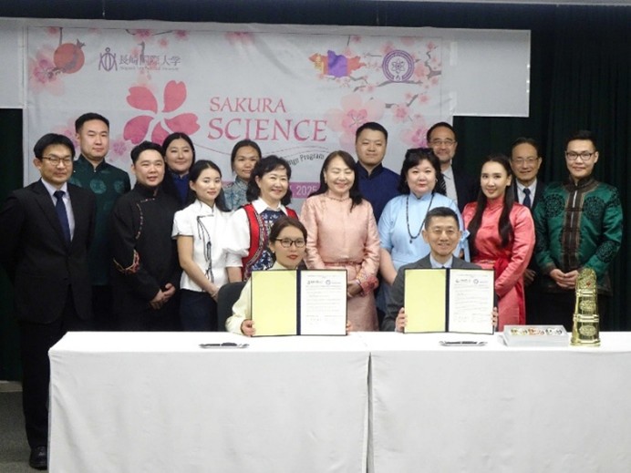 2025年12月1日、長崎国際大学はモンゴル薬科学大学と学術・教育交流に関する基本協定を締結しました。今回の協定締結は、宇都教授が実施主担当者として申請した、国立研究開発法人科学技術振興機構(JST)による「さくらサイエンスプログラム」への採択を契機として実現しました。調印式には、モンゴル薬科学大学から Selenge Erdenechimeg 副学長をはじめ、教職員および学生あわせて12名が出席し、本学からは中村誠司学長、藤田英明薬学部長、綾部賢一郎事務局長、宇都教授が出席しました。モンゴル薬科学大学の皆さんは色鮮やかな民族衣装で参加され、終始和やかで国際色豊かな雰囲気の中、協定書への署名および記念品の交換が行われました。なお、本協定締結の様子は、長崎新聞ならびにテレビ佐世保の取材を受け、地域メディアを通じて広く紹介されました。本協定を通じて、今後の共同研究や学生交流など、国際的な研究・教育活動のさらなる展開につなげていく予定です。